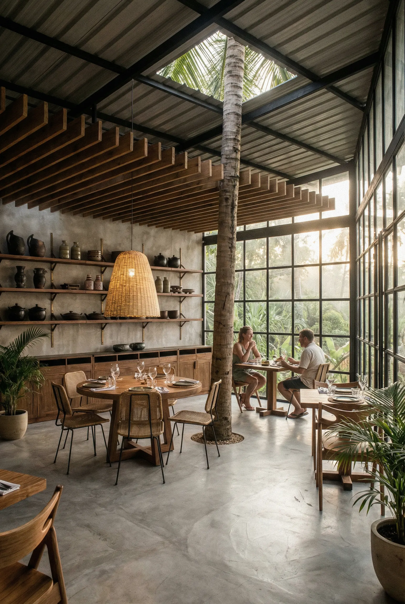 Life at LUNU centres around our open-air restaurant, bar, and pool area. Double-height repurposed shipping containers and a steel structure with warehouse-style windows frame a single palm tree, creating a striking focal point.